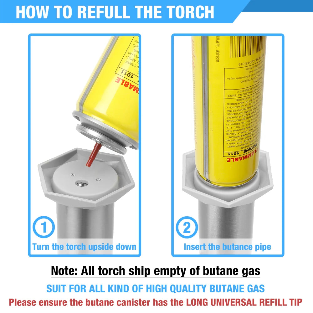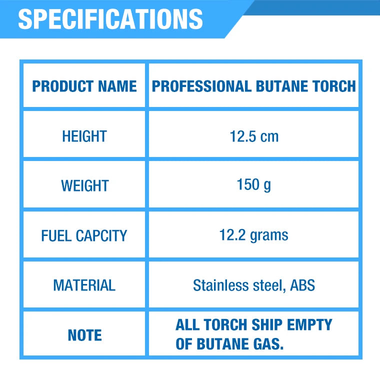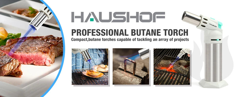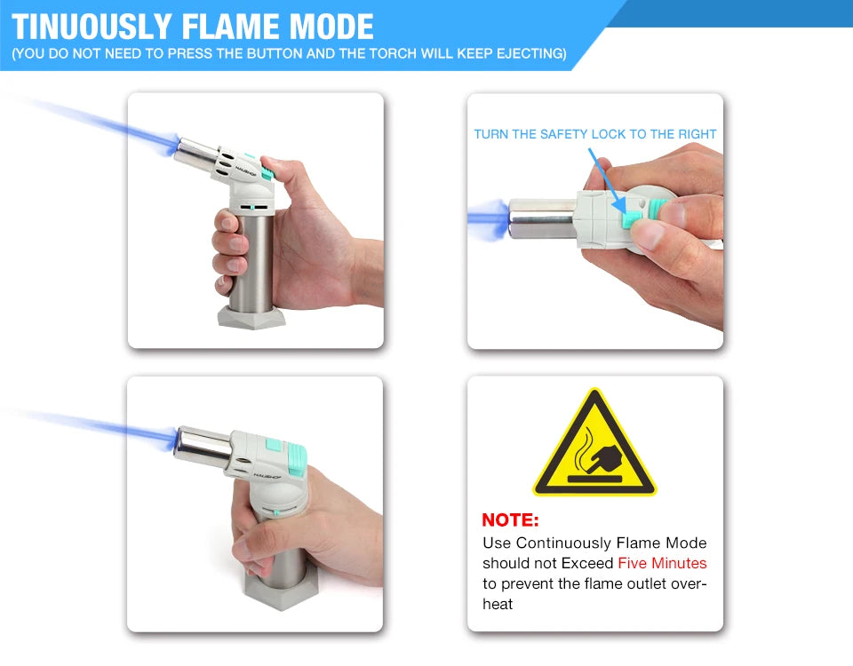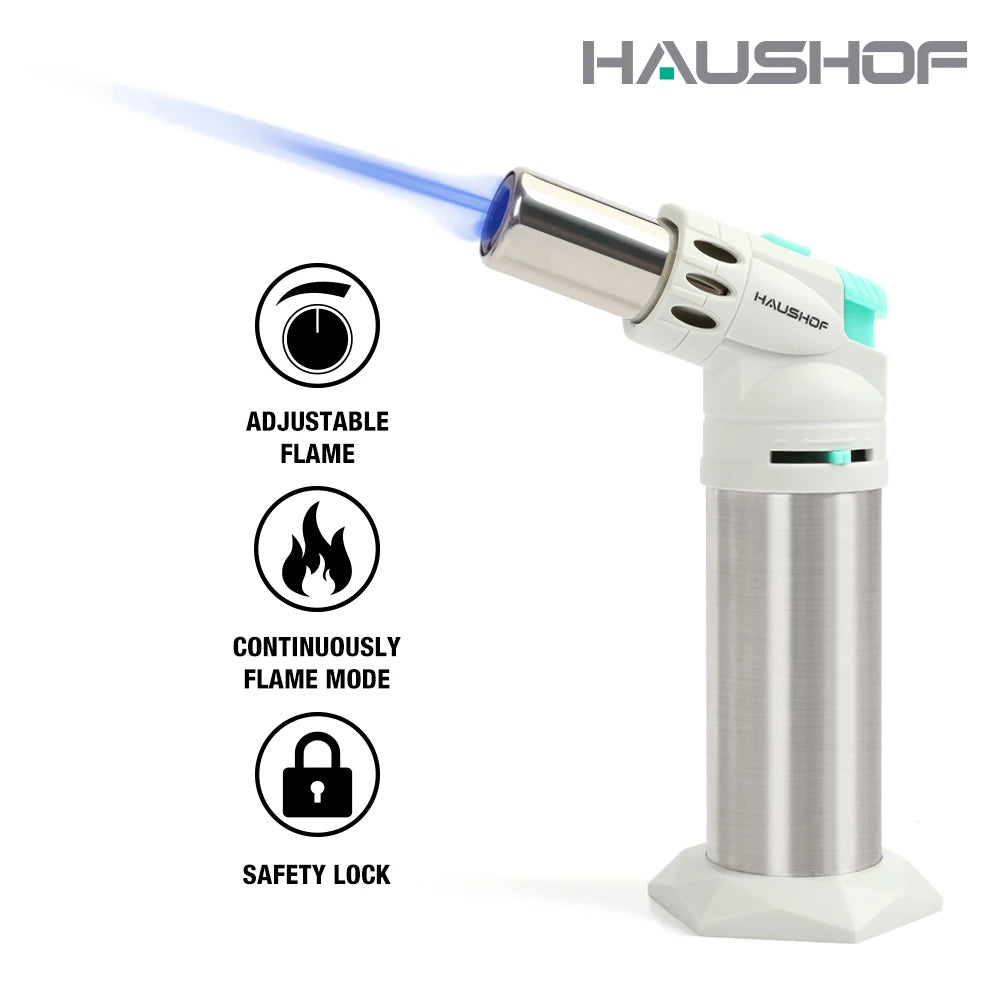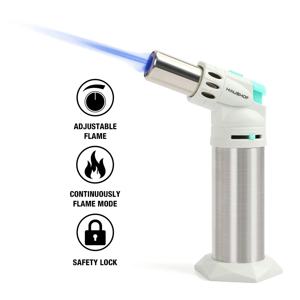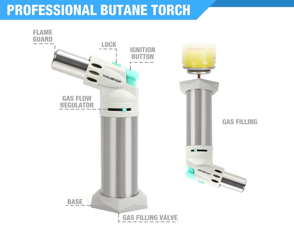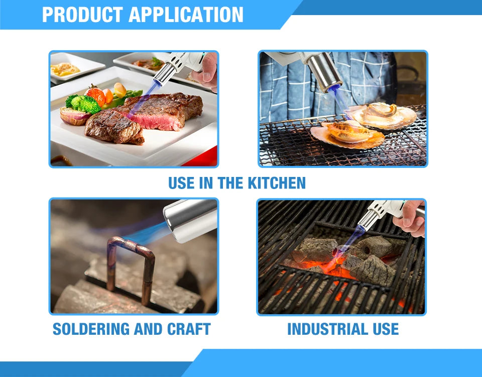 Maçarico culinário recarregável (butano não incluso) com chama ajustável. Ideal para crème brûlée, grelhar acabamentos, BBQ e confeitaria. Acionamento manual, corpo leve e portátil.
