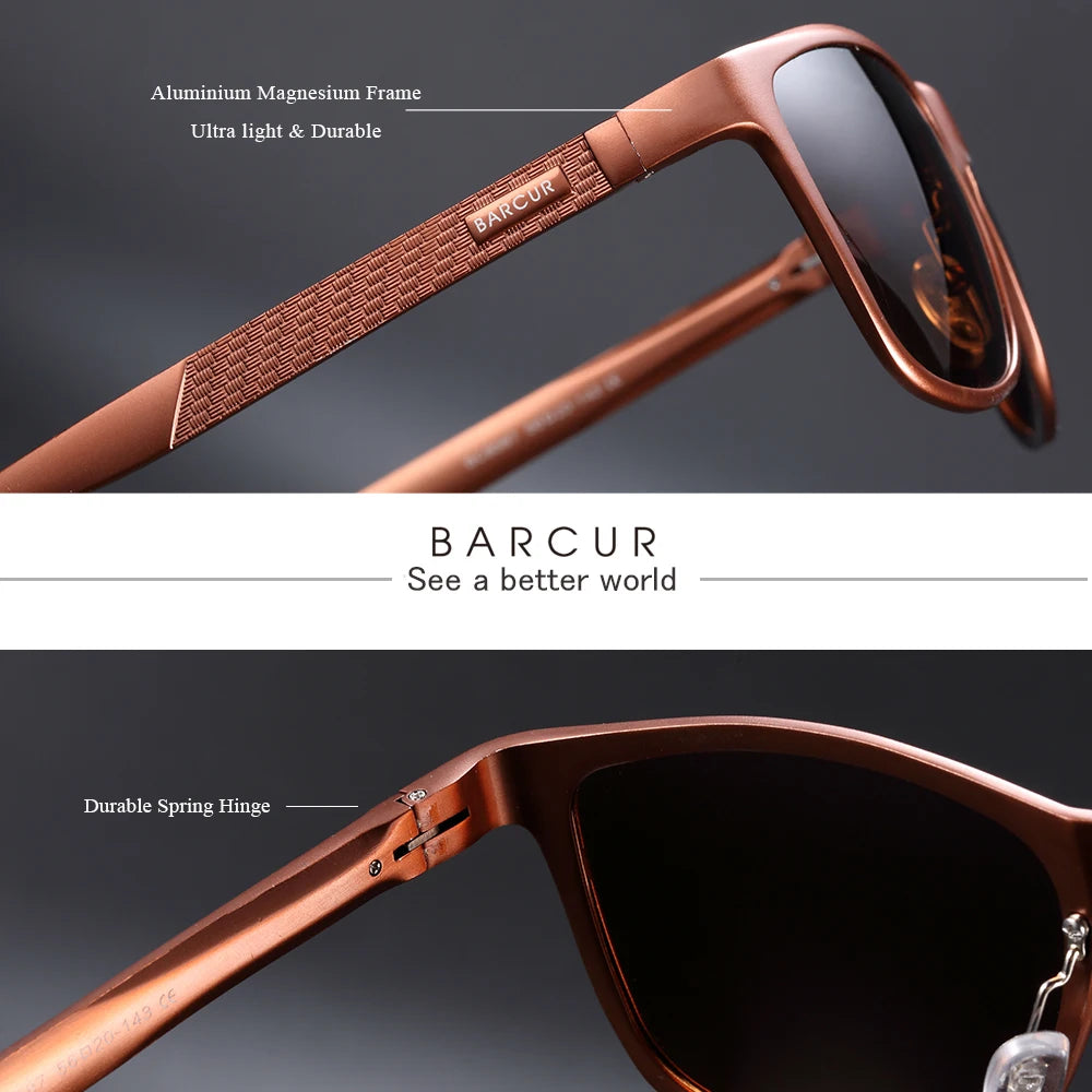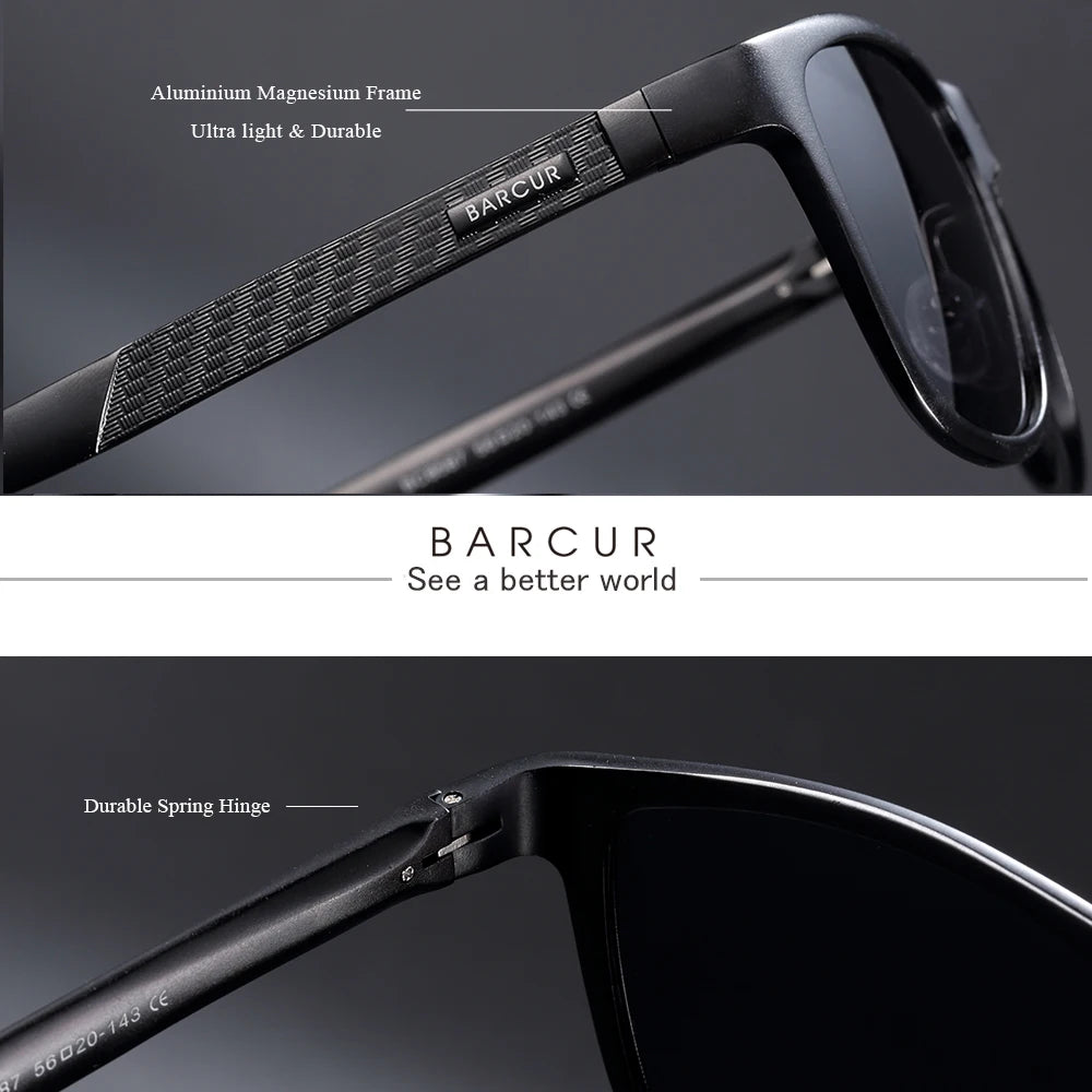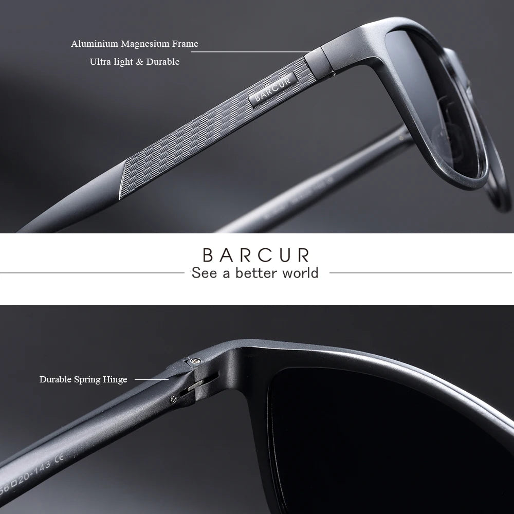 Armação em liga de alumínio-magnésio ultraleve e resistente, lentes polarizadas UV400 com tratamento anti-reflexo. Estilo quadrado unissex, conforto diário e visão nítida em sol forte e direção.
