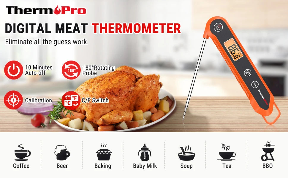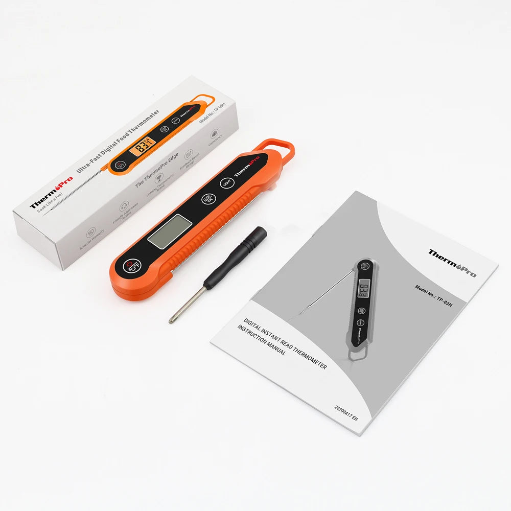Termômetro dobrável ThermoPro TP03H com sonda 10 cm, backlight, trava de leitura (Lock) e IPX6. Faixa -50 °C a 300 °C (±0,5 °C de 0–100 °C). Usa 1× AAA (não inclusa).