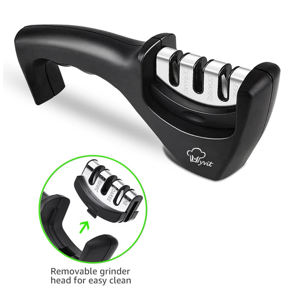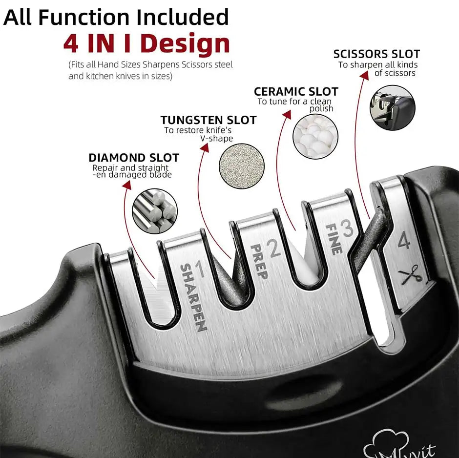 Afiador manual com 3 ou 4 estágios (diamante, tungstênio e cerâmica), base antiderrapante e pegador ergonômico. Restaura, afia e poles o fio. Opção 4 estágios inclui slot p/tesouras.